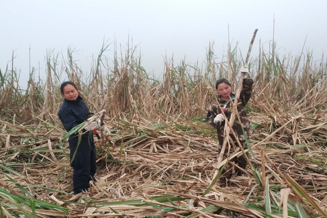 乡机关干部职工干劲十足,分为砍、运两个组,女同志负责砍甘蔗,男同志把砍好的甘蔗捆绑好抬到甘蔗车上。示范基地面积5亩,估计产量能达到30吨左右,这些甘蔗将作为甘蔗种苗发放给群众种植。