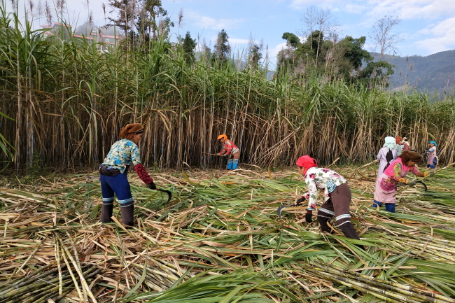 晴空万里,10多亩甘蔗根根粗壮挺拔,一片片甘蔗叶随风摆动,蔗农代思扎正安排工人对甘蔗进行抢收。两名农工举起手中锋利的小锄头,贴近地面的根部收砍甘蔗,其他工人紧随其后削剥甘蔗壳和捆绑甘蔗,一捆捆扎好的甘蔗堆成一摞准备装车,蔗农的脸上洋溢着丰收的喜悦。