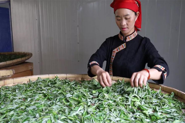 村民晾晒刚采摘的古树茶