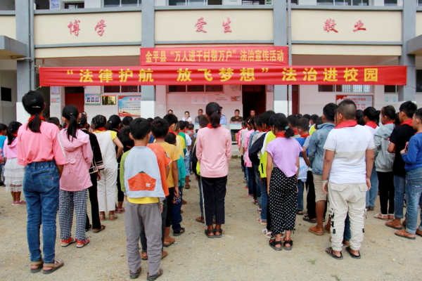 为进一步提高在校学生的法治意识,安全防范意识,打造平安和谐校园。8月28日,由金平县委全面依法法县办公室牵头,组织县司法局、县教育体育局、县融媒体中心、金水河司法所、金水河边境派出所联合组成普法宣讲团,深入中越边境一线金水河镇乌丫坪小学开展“法律护航· 放飞梦想”法治进校园暨“万人进千村帮万户”法律服务活动,对该校200余名学生进行了法治宣传教育。