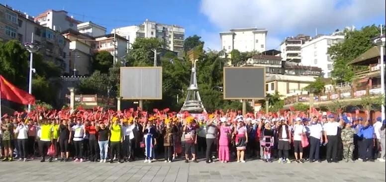 秋风送爽,晴空万里。上午8点整,来自各行各业的干部职工齐聚民族团结广场,开展“迎国庆•强体质•决战脱贫攻坚”2019花果山徒步活动,从而进一步凝聚人心、增强信心、鼓舞斗志、激发全县干部群众干事创业的热情,本次活动以民族团结广场为起点,途经花果山公园、渔洞村、观音庙村,以黄金水库为终点,往返总里程约10公里。