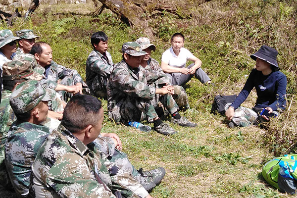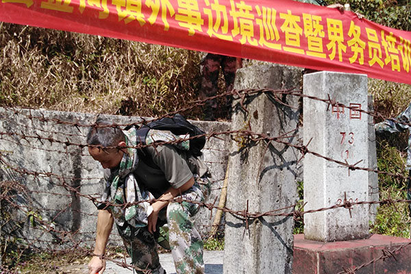 来到这里,县政协副主席张雄伟首先抡起镰刀为我国这块雄伟庄严的界碑坎除草,紧接着,大家也跟着忙活了起来,一起打扫卫生、清除界碑上的青苔等。随后,大家便在界碑脚下围成一团开始今天最重要的一项内容即实地培训。县外事办主任蒋婷婷与界务员们分享了开展此次活动的重要意义,鼓励界务员们畅所欲言,同时也为今后一段时期的工作任务和要求做了强调。她说:我们要把边界巡查、边境管理工作与当前我县最重要的脱贫攻坚工作相结合,要一切工作服从脱贫攻坚,一切工作服务于脱贫攻坚,努力为我县2019年脱贫摘帽贡献一份力量,为老百姓脱贫致富献计献策。张雄伟副主席、赵庆红副县长也先后对大家提出了要守好边、护好界的要求,鼓励界务员们要在县委、县政府的正确领导下,履行好职责,守护好每一寸国土。
