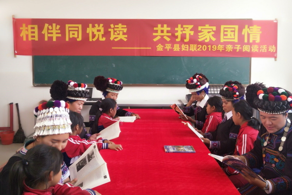 活动中,县妇联、县图书馆、县新华书店向学校捐赠了3000多册课外书籍和学习用品,同学们收到新书都露出了笑脸,迫不及待的看起了书。接着,学生代表纷纷上台朗读自己喜欢的作品。在学校阅览室里,身着民族服装的妈妈与孩子亲密的坐在一起读书,营造亲子共读、全民阅读的浓厚氛围。