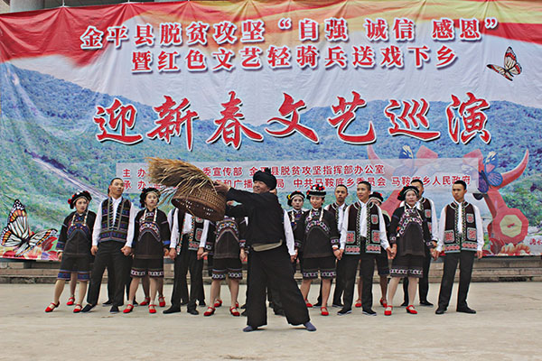 春节来临之际,为深入贯彻落实党的十九大精神,满足人民群众对美好精神文化生活的需要,助力全县打赢脱贫攻坚战暨庆祝改革开放40周年,金平县以脱贫攻坚“自强 诚信 感恩”为主题的“红色文艺轻骑兵”迎新春文艺汇演走进马鞍底乡,为全乡群众送去了欢乐,传递党的声音和关怀。