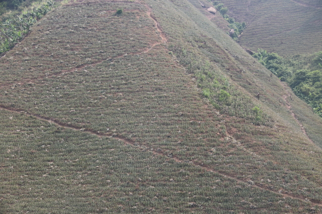在勐桥乡大滩苗寨菠萝地头可以看到,一排排的香菠萝植株挤挤挨挨的沿着坡地一路排开,当地贫困群众小心地把杂草清除,看到已经长成淡黄色的香菠萝就可以采收了,还是绿色的则要等几天以后再采收。