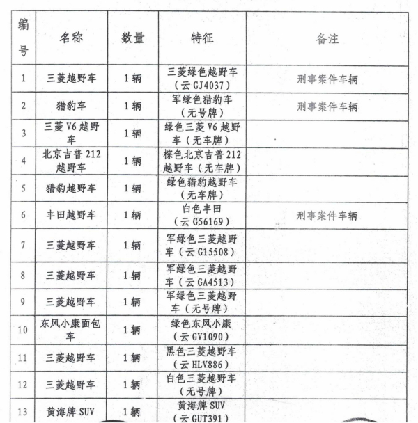 为切实保障人民群众生命健康安全,维护社会市场经济持续平稳发展。近年来,金平县各有关职能部门重拳整治,严厉打击边境地区走私违法行为。各执法部门先后对一批涉案车辆采取了行政强制措施,因部分车辆所有人、驾驶人长期未来接受处理或无法提供车辆合法手续,导致车辆长期积压,造成了工作中的不便。经金平县交警大队对暂扣的涉嫌运输走私无主货物的车辆进行清理,发现13辆涉案机动车属于无牌无证、套牌或达到报废标准。现将13辆涉案车(详见附件)基本信息进行通告,请车辆所有人或驾驶人携带车辆合法手续于本通告发布之日起,15个工作日内到金平县政府打私办进行处理,2020年9月18日前无人认领的车辆,将根据《中华人民共和国道路交通安全法》《中华人民共和国道路交通安全法实施条例》《机动车强制报废标准规定》等有关规定,将无人认领的车辆移交执法部门强制报废。