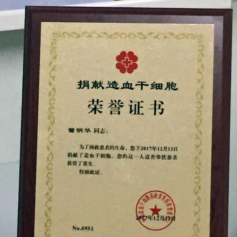 曾明华,在得知自己与一名郑州白血病患者成功配型后,他毅然决定捐献造血干细胞拯救从来谋面的他。曾明华他说:“要实现捐髓救人也是要靠缘分,我和患者他能配型成功是一份不浅的缘分,我捐点造血干细胞就能救活他一条命,我认为非常值得。这是我有生以来做过最有意义的一件事……”,在从他手臂处采集完成 289毫升造血干细胞混悬液后,他兴奋地告诉我们:“捐献造血干细胞后只是出现一点点乏力外,没有其它不良反映,救人一命的大事其实也可以这样简单的做了,我也希望身边更多的人能加入到造血干细胞捐献志愿者队伍中来。”