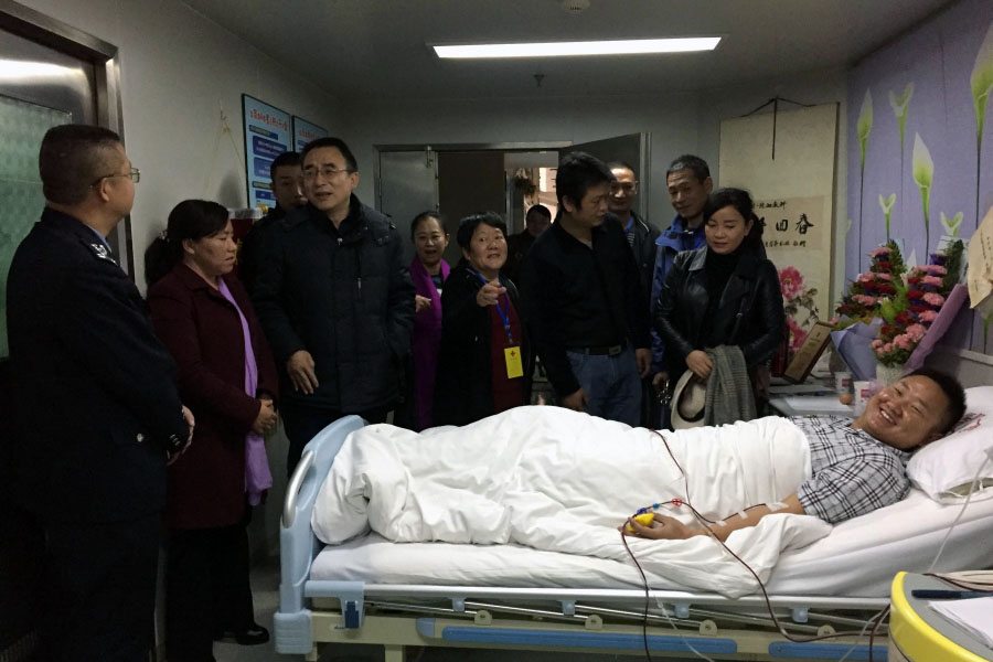 省、州、县领导看望慰问(左一为公安局政委黄开灿,左二为州红十字会副会长普红芬,左三为中国造血干细胞捐献者资料云南分库主任黄杰)