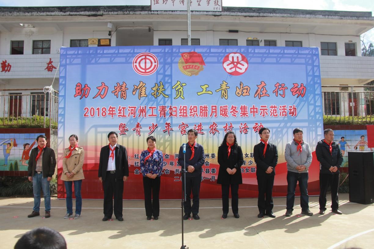 近日,由红河州总工会、共青团红河州委、红河州妇联共同组织的“助力精准扶贫.工青妇在行动” 2018年工青妇组织腊月暖冬集中示范活动暨流动青少年宫进农村活动在金平县板板桥小学启动。云南省青少年发展基金会负责人、共青团云南省委调研员李燕飞,中共红河州委副书记、州委宣传部部长盛高举,红河州政协副主席、州总工会主席普菊红,共青团红河州委书记李媛,红河州妇女联合会副主席杨卫佳,中共金平县委书记杨国椿,州委副秘书长刘磊,县委副书记师绍文,县工青妇组织主要负责人,以及沪滇扶贫接力志愿者代表、爱心人士代表出席活动。州委副书记盛高举出席活动并作动员讲话。