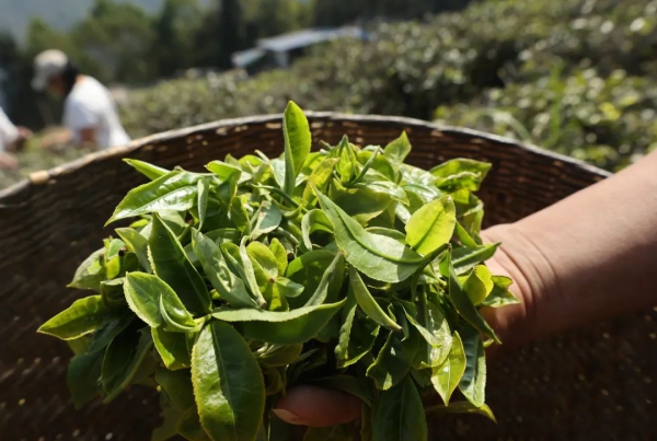 走入茶园,不同姿态的茶树层层叠叠,满目绿意,采茶人戴着斗笠,背着茶篓,在山间茶树丛中来回穿梭、采摘。嫩芽采摘下来后,经过杀青、揉捻、发酵、烘焙、分拣,制作成品。