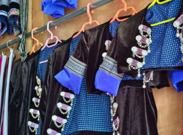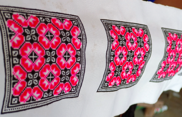 苗族是营盘乡世居民族,苗族服饰花色品种繁多,到熊板这里加工的多是短款褶裙、围腰、上衣。从苗绣到成衣,需要耗费大量的精力和时间,妇女们先是在家通过一针一线绣成苗绣图案,然后把做好的苗绣交给熊板,由她来缝制成衣。