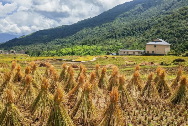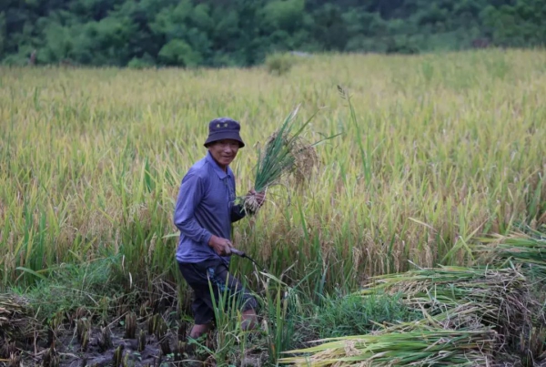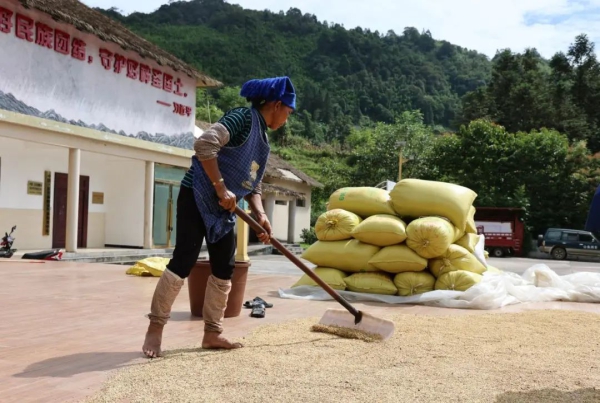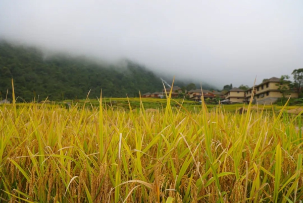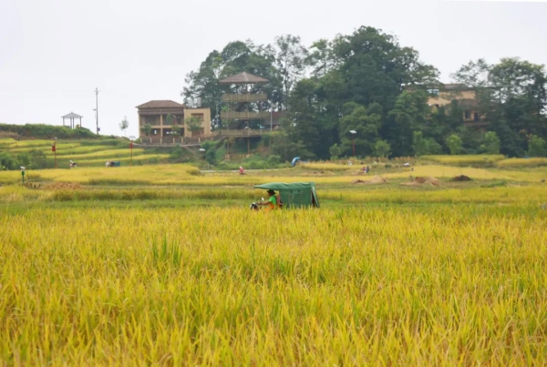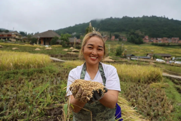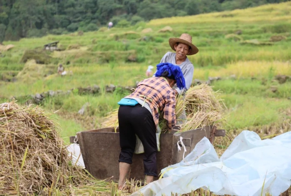 在秋风送爽的日子里,马鞍底乡的梯田被大自然的画笔染上了绚烂的色彩,绵延的山川、金灿灿的稻谷、洋溢着笑容的农人共同勾勒出“喜看稻菽千重浪”的丰收图景。