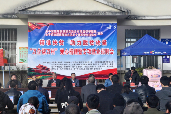 1月17日,金平县市场监督管理、金平县个体私营经济协会联合县内16家企业及个体工商户在金河镇枯岔河村委会开展精准扶贫、助力脱贫攻坚,“万企帮万村”爱心捐赠暨专项就业招聘公益活动。