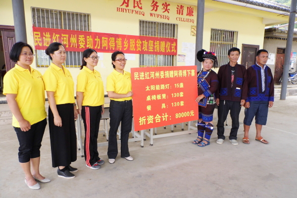 为加快推进边疆高寒山区少数民族群众脱贫攻坚进程,在去年12月4日深入实地开展调查研究的基础上,民进红河州委一行6人受民进云南省委的委托,在民进云南省委委员、民进红河州委专职副主委邓智珍的率队和金平县委统战部常务副部长陶秀珍、副部长兼县工商联党组书记王志林的陪同下,于2018年8月15日到金平县阿得博乡阿得博村委会阿得博下寨村民小组开展了“助力脱贫攻坚捐赠仪式”。此次捐赠活动,共向阿得博下寨村民小组捐赠了15盏太阳能路灯(于今年7月23日安装调试,现已正常运行投入使用,价值5万元)、村民小组公用饭桌(木制80×80cm规格)及凳子、餐具共130套(价值3万元),捐赠物资折合人民币共计8万元。