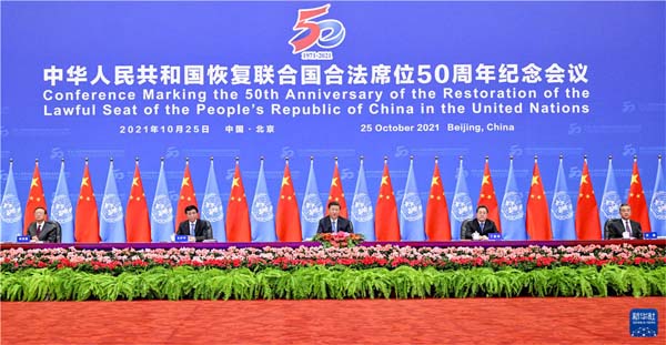 10月25日,国家主席习近平在北京出席中华人民共和国恢复联合国合法席位50周年纪念会议并发表重要讲话。新华社记者 李学仁 摄