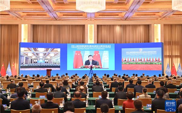 10月25日,国家主席习近平在北京出席中华人民共和国恢复联合国合法席位50周年纪念会议并发表重要讲话。新华社记者 李响 摄
