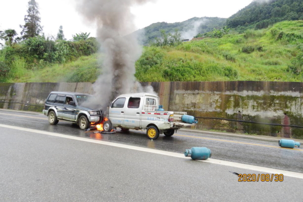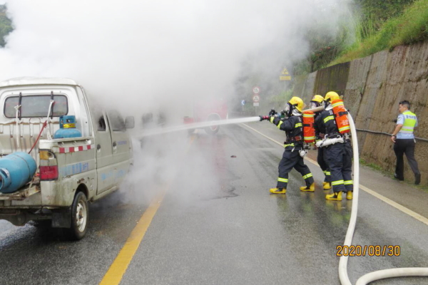 演练背景设定:在金平县境内蛮金二级公路K52公里路段,一辆违法装载危化品的小型货运车辆违规拉载液化气罐,因雨天路滑,驾驶员操作不当与对向车道一辆正常行驶的越野车发生正面碰撞。事故造成小型货运车辆车体变形无法移动,且油箱破损并起火燃烧,车上所载液化气罐散落现场,驾驶人被困车内昏迷不醒,伤势严重。越野车2名驾乘人员受轻伤。
