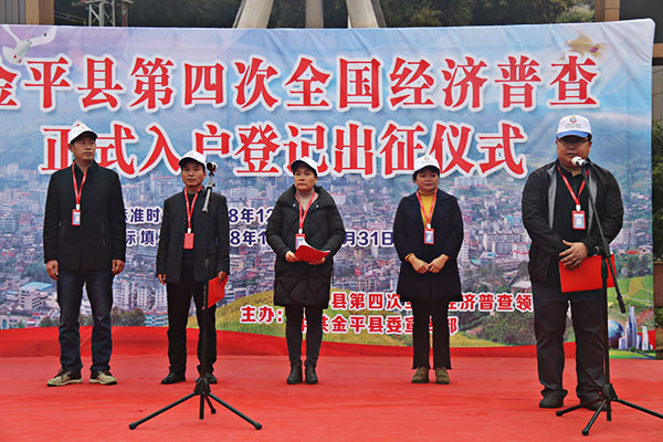 根据《全国经济普查条例》的规定,为确保金平县第四次全国经济普查正式入户登记工作顺利开展,2019年1月1日上午,金平县在民族团结广场举行金平县第四次全国经济普查正式入户登记出征仪式活动。县委常委、县人民政府副县长、县驻村扶贫工作队副总队长陈来三同志,县经济普查领导小组成员单位相关领导,县经普办全体成员及部分乡镇普查指导员和普查员代表,县城部分单位、企业及个体工商户代表参加了出征仪式。县政府办副主任彭云川主持仪式活动。