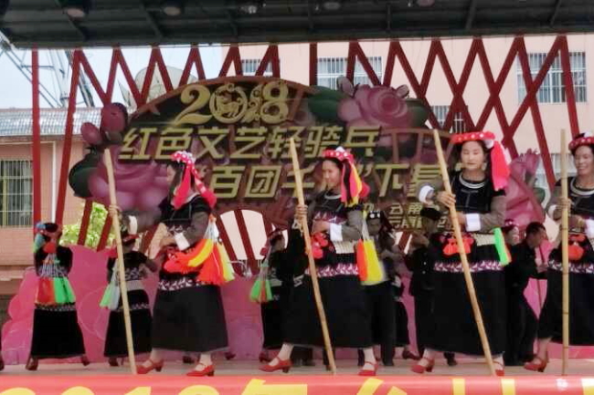 演出在花灯歌舞《闹花灯》热烈明快的音乐声中渐渐展开,花灯歌舞《十大姐》、打击乐《男儿当自强》、竹笛独奏《帕米尔的春天》等11个节目受到了当地群众的掌声不断,尤其是结合当前精准脱贫攻坚的小品《雨后彩虹》,更是深入生活、打动观众,让当地群众深受教育。除金平县民族文化工作队“红色文艺轻骑兵”助阵演出外,金平县马鞍底乡的两支当地农村文艺队作了交流表演、演出了彝族舞蹈《乐作》和哈尼舞蹈《风情舞》,让当地农村文艺队有了一次难得的学习机会、很受感动。