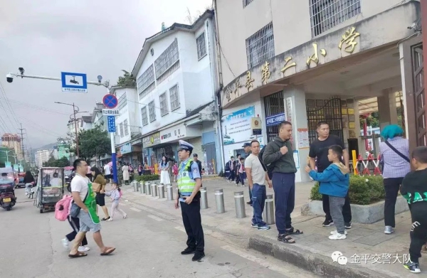 为进一步打造平安、畅通、有序的道路交通环境,保证广大师生的出行安全。自秋季开学以来,金平县公安局交警大队以学生上、下学时段为基础,积极调整勤务模式,延长执勤时间,坚持在校园门口及周边主要路口开展“护学”执勤工作,全力保障校园交通安全,构筑牢固交通安全防线。