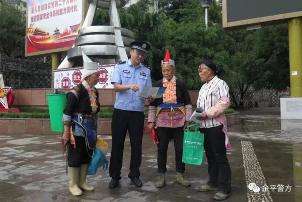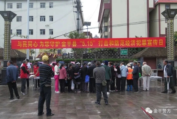 金平县公安局经侦大队抽调民警与县金融办、人民银行、农村信用社、农业银行、邮政储蓄、富滇银行等金融单位工作人员组成联合宣传组,紧紧围绕非法集资、传销、养老诈骗、银行卡诈骗、假币、反走私、网络赌博等社会危害严重、社会公众较为关注的犯罪活动,通过现场讲解、发放宣传资料、提供法律咨询等形式,认真向广大群众普及宣传讲解各类经济犯罪活动的形式、手段、特点和防范措施,同时呼吁广大群众积极向公安机关举报各类犯罪线索,共同构筑经济犯罪安全防线。