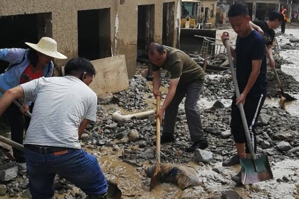 各党员干部积极发扬“大难当前,冲锋在前”的精神,本着为群众解难事,办好事的初心, 到达灾区第一时间,立刻投入受灾现场,组织各救援队并带领广大村民,有序开展救灾自救活动。党员干部们帮助受灾村民清理住宅淤泥、碎石、从上游冲击下来的众多树干残枝等等。大家不怕脏,不怕累,带领群众干,干给群众看,充分体现了共产党员的先进性,体现了共产党员始终把人民利益放在最高位置的初心,得到了广大村民的赞许。