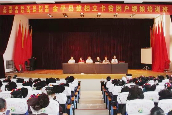 会上,上海市长宁区妇女联合会党组书记、主席、上海市儿童发展基金会长宁分会会长王秀红向我县妇联主席谭云碧授牌成立“金平绣娘大联盟合作社”,并作热情致辞,同时由长宁红河妇联“绣娘大联盟项目实施推广人”、上海华恩爱心志愿服务社社长靳英丽为来自我县百余名建档立卡贫困户绣娘现场培训。培训理论与实际相结合,图文并茂,内容有花样设计、刺绣技巧等,采取一对一、手把手的现场交流指导,面对面地沟通。通过培训,使参加培训的妇女充分掌握刺绣技法,能够独立制作刺绣品,将时尚元素融入少数民族传统绣品中,进一步促进绣娘居家就业创业,增能增收。