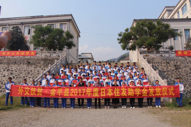 3月16日,在金平一中举行外交扶贫·金平县2017年度日本住友助学金发放仪式。外交部派驻金平县第十七任扶贫代表、县委常委、县人民政府副县长冯胤出席发放仪式。县外援扶贫办副主任杨菊、县教育局副局长王光兴、金平一中校长曹金保参加了发放仪式。