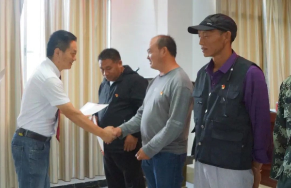 开班前,全体参训学员为6月份入党的7名党员代表过集体“政治生日”,乡党委书记为他们送上“政治生日”贺卡。贺卡不仅承载着党组织诚挚的祝福,也满怀党组织对党员的关怀和鞭策。随后,在乡党委书记董春进的领誓下,全所党员面对鲜红党旗重温入党誓词并奏唱国歌。