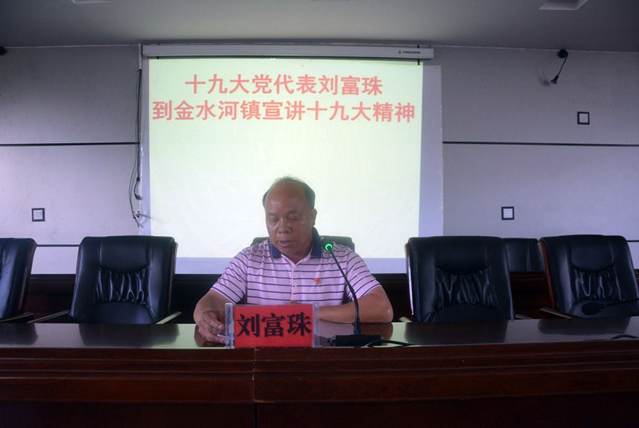 为深入学习宣传贯彻党的十九大精神,把力量凝聚到实现金水河镇跨越式发展的目标上来,2017年11月15日,金水河镇开展学习宣传贯彻党的十九大精神暨在脱贫攻坚中深入开展“自强、诚信、感恩”主题——十九大精神进机关实践活动。邀请党的十九大代表刘富珠同志,为金水河镇人民政府全体干部职工、驻金水河各机关单位代表、驻金水河部队官兵等60余人宣讲党的十九大精神。