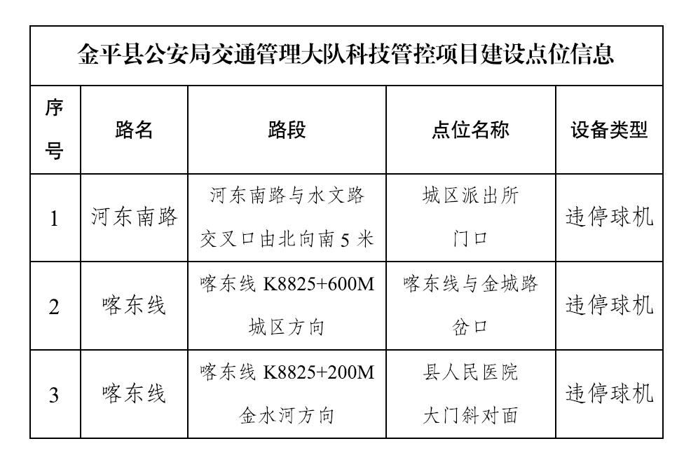 为进一步强化道路交通安全管理,维护交通秩序,缓解交通压力,提升人居环境。根据《中华人民共和国道路交通安全法》《云南省道路交通安全条例》和公安部《道路交通安全违法行为处理程序规定》等法律法规,结合金平县城区及周边道路交通安全管理工作实际,金平县公安局交通管理大队将对河东南路及喀东线重点路段交通违法行为进行自动抓拍处罚。现将有关事项通告如下: