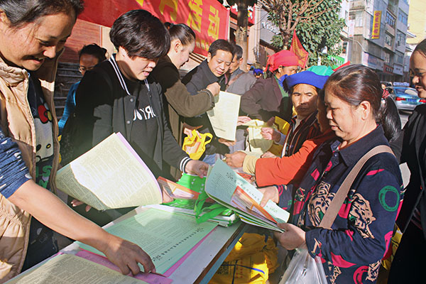 11月25日,金平县委统战部、县民宗局、县司法局等民族宗教工作领导小组成员单位利用县城赶集日在行人较多的县城十字路口开展“民族团结宣传月”活动。
