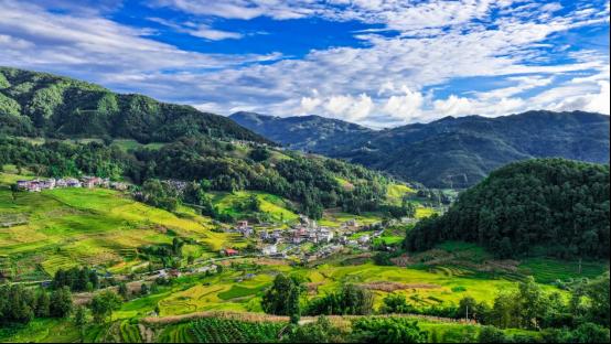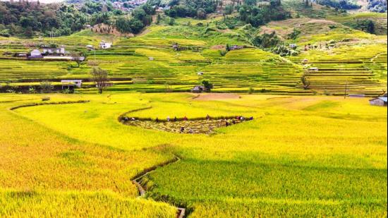 站在田埂放眼望去,金黄的水稻层层铺展,将大地装点得如梦如幻,环绕山坡的梯田仿若通往丰收的金色阶梯 ,在阳光的轻抚下闪耀着希望的光芒。微风