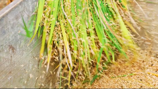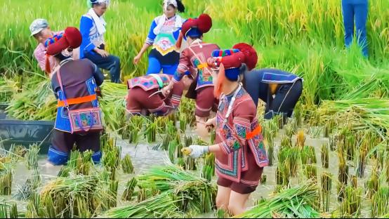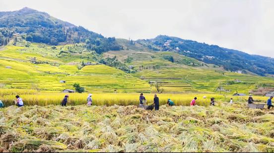 由于金河镇梯田地块小且地形起伏较大,大型农机难以使用,传统收割方式便延续至今。农户们分工协作,前面的人手持锋利镰刀,手法娴熟地割下水稻;后面的人迅速抱起,伴随着一抬一放的动作,饱满的稻谷欢快地跃入打谷槽, “嚓嚓”的脱粒声与人们的欢声笑语交织在一起,奏响了一曲欢快的丰收乐章。