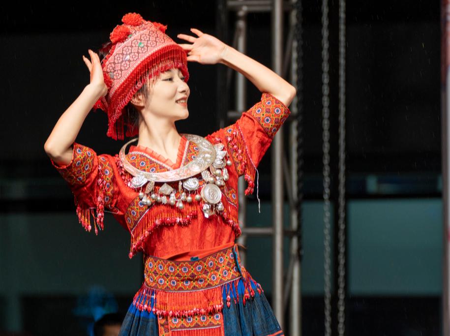 首组登场的苗族服饰,宛如一部流动的文化史书。绣花纹样承载着古老传说,每一针每一线都蕴含着先人的智慧和情感;银饰配饰闪耀着匠人智慧,在灯光下闪烁着迷人的光芒。“老绣新用”的创新理念,让传统盛装焕发出新的生机与活力,它不仅是一件衣裳,更是一段流动的文化记忆,连接着过去与现在。