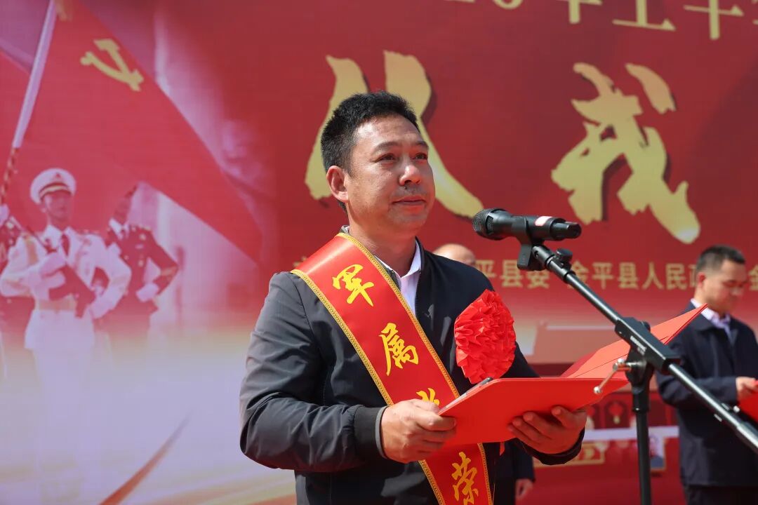 领导为新兵及家属佩戴光荣花,全体新兵高举右拳庄严宣誓。铿锵誓言响彻广场,彰显金平子弟忠诚报国的赤子之心。