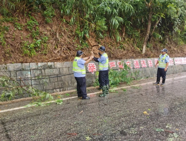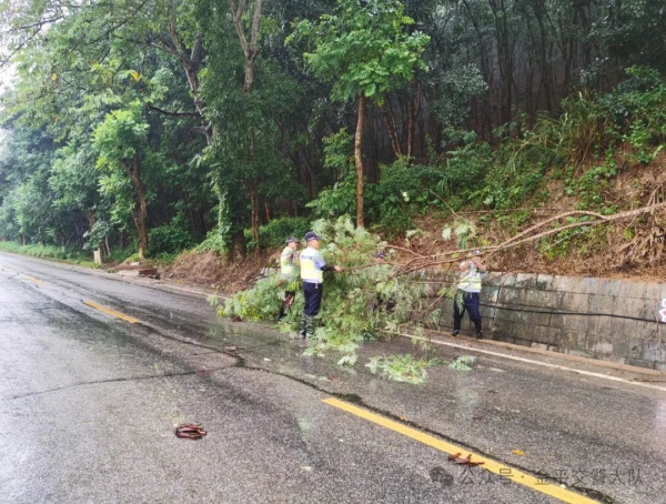9月9日,在蛮金二级路巡逻时,执勤民辅警发现有树木被大风刮倒,影响道路交通通行安全,极容易造成交通安全事故发生。为了让道路尽快恢复通行,执勤民辅警变身“大力士”,不顾大雨,迅速合力将断裂树枝清理至路面以外;遇到“顽固”的树枝,合力用镰刀等工具将其砍断后,清理到安全地带,及时消除了道路安全隐患。与此同时,在拥堵路段对交通进行疏导,不断提醒过往的车辆和行人一定要注意安全,保护车辆安全通行。