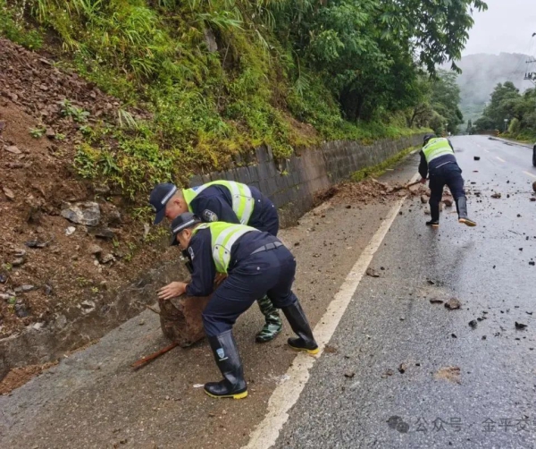 为了切实确保道路的安全、畅通以及有序,金平县公安局交警大队全体民辅警开展路面巡逻管控工作,采取固定执勤与流动巡逻相结合的方式,加强路面巡逻,通过亮警灯、鸣警笛等措施提醒驾驶员雨天慢行,全力确保辖区交通运行安全、有序、畅通。