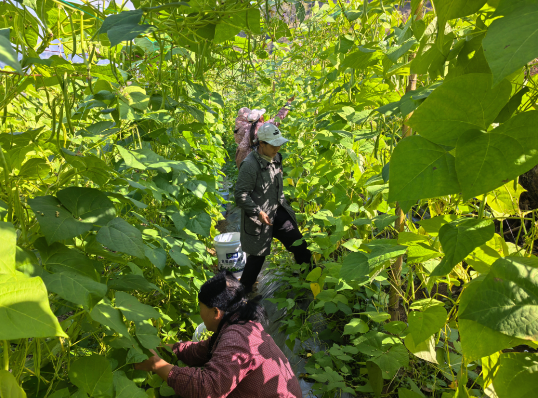 豇豆、金豆产业的壮大,自然催生了大量的就业岗位,形成了“一人种豆,多人务工”的辐射效应,进入采收期的豇豆金豆,每天都需要大量的采摘工和分拣工,让村民实现了家门口也能有班上。“像我们公司种植的50亩豇豆,目前是每天都需要50个工人,日工资100—150元不等。现在金豆马上可以采摘,我们还要从本地大量招人,让他们在家门口摘摘豆、捡捡豆,赚点生活费,还能顾顾家,两全其美。”普坚祥介绍道。