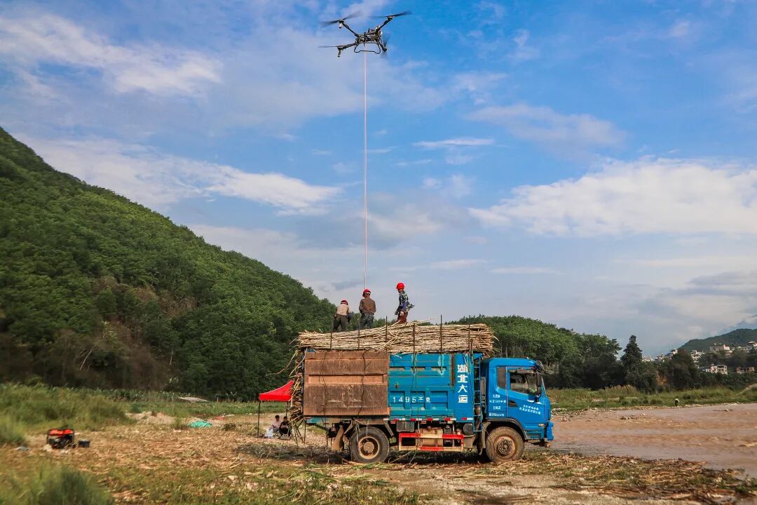 蔗地里,操作员手持遥控器精准操控,无人机稳稳吊起成捆甘蔗后,精准投放至指定运输车,全程高效有序、省时省力。现场技术人员介绍,该型号农用无人机单次最大载重100公斤,日均作业量约20吨,相当于25名劳动力的工作量。
