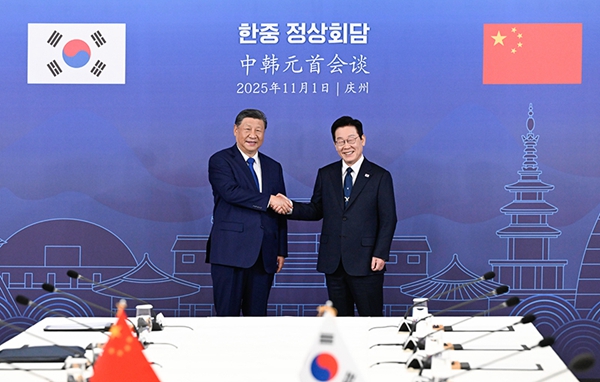 当地时间11月1日下午,韩国总统李在明同中国国家主席习近平在庆州博物馆举行会谈。这是两国元首握手合影。新华社记者 黄敬文 摄