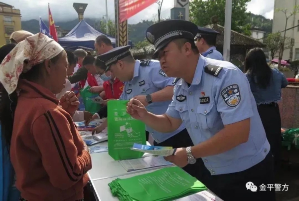 金平县公安局经侦大队抽调民警与县金融办、人民银行、农村信用社、农业银行、邮政储蓄、富滇银行等金融单位工作人员组成联合宣传组,紧紧围绕非法集资、传销、养老诈骗、银行卡诈骗、假币、反走私、网络赌博等社会危害严重、社会公众较为关注的犯罪活动,通过现场讲解、发放宣传资料、提供法律咨询等形式,认真向广大群众普及宣传讲解各类经济犯罪活动的形式、手段、特点和防范措施,同时呼吁广大群众积极向公安机关举报各类犯罪线索,共同构筑经济犯罪安全防线。
